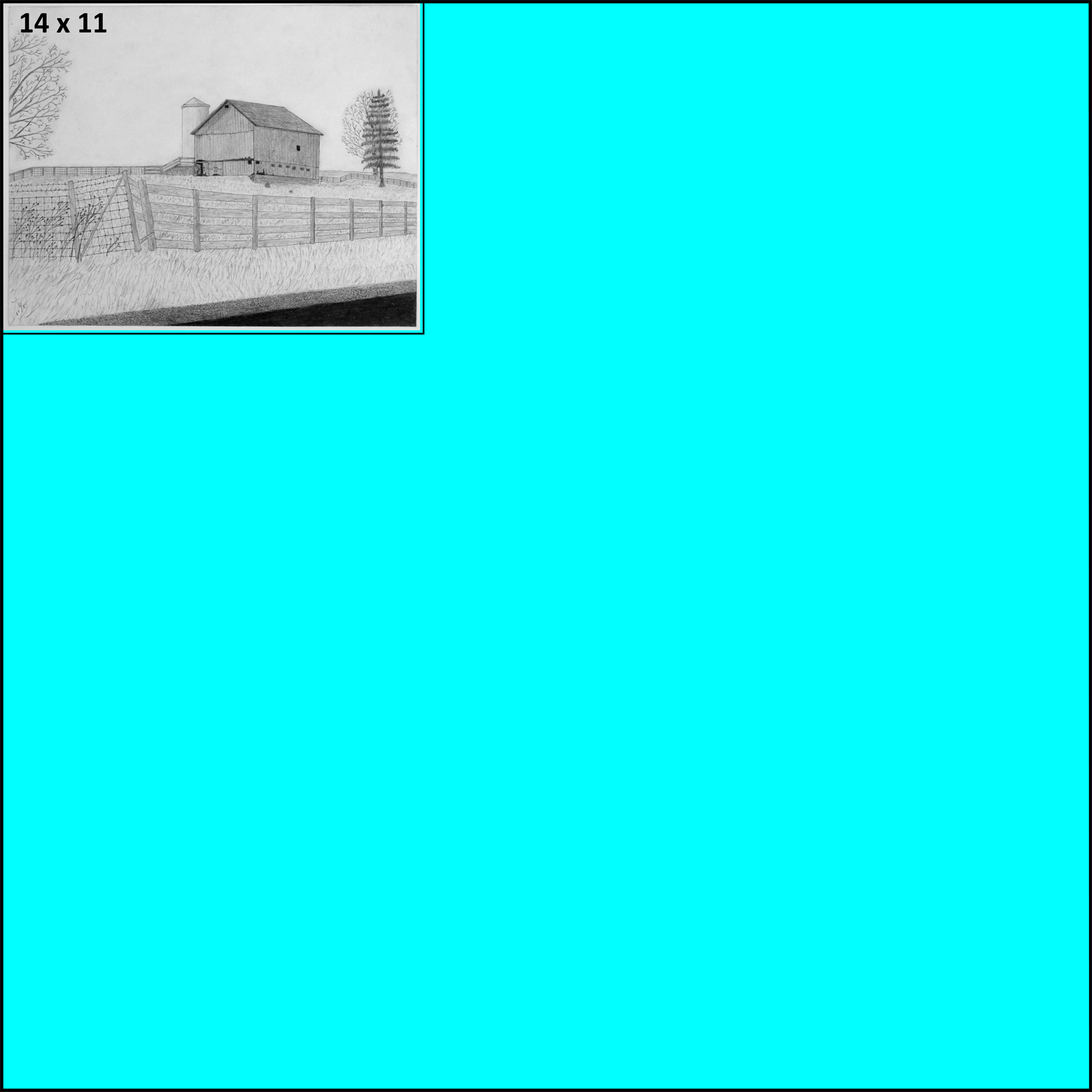 Crystal Springs Road, McHenry Co, IL, first barn drawn, field drawing in notebook, transerred to heavy art paper