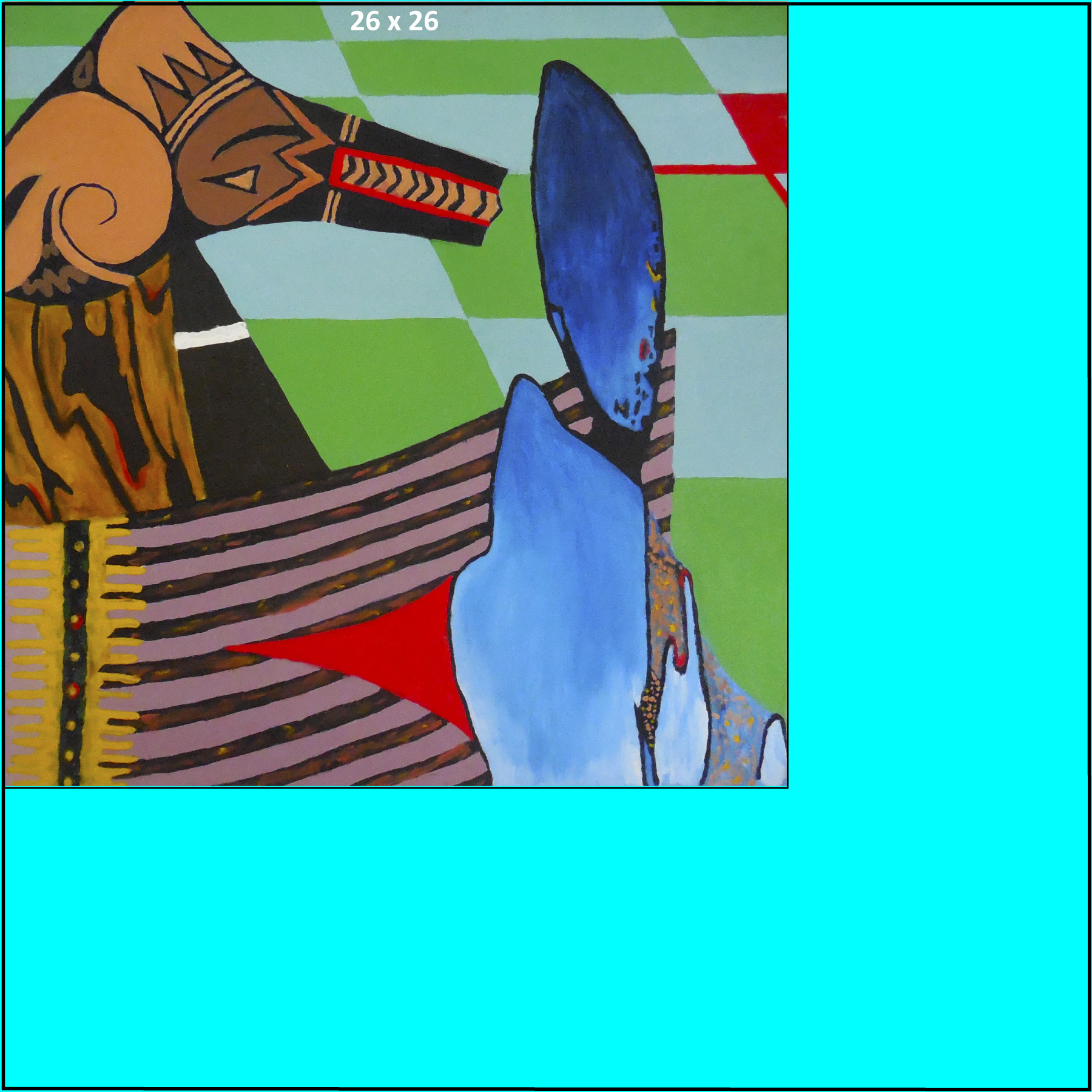 | October 2004, 26x26, oil on canvas McHenry County College Painting Class project; assignment was to transfer small objects by the grid method taped to the back of the painting "horse head" is actually a cut-out picture of decorated pottery, the brown below is a picture of soft material, blue are from an areal photo of lakes in northern Canada, etc, all from magazines on hand in the art class | |